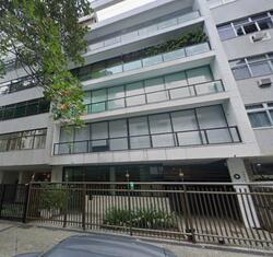 Apartamento 201, situado na Rua Aristides Espínola, 27, Leblon, Rio de Janeiro/RJ. O imóvel conta com três suítes, todas com piso em madeira nobre. A suíte master tem closet e banheiro duplo, sendo um deles com vazamento no teto. A cozinha tem bancada de